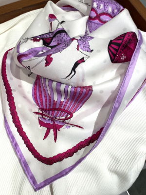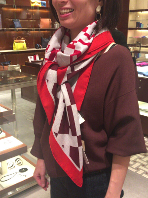 今回はご役職と業種に合わせてベーシックカラーを全体的にチョイスも、エルメスのスカーフで華やかさもプラス! オシャレでも周りと差をつける小物使いをご提案。