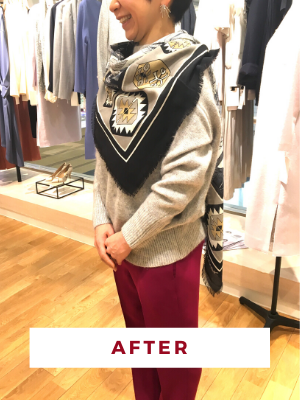 自分の持ち味を生かしながら理想のイメージを実現することが可能 だということを実感しています。 次のシーズンもぜひパーソナルショッピングをお願いしたいと思っ ています。Nahokoさんに出会えて、本当に良かったです。