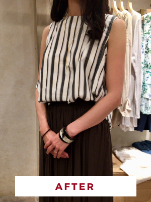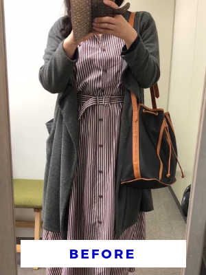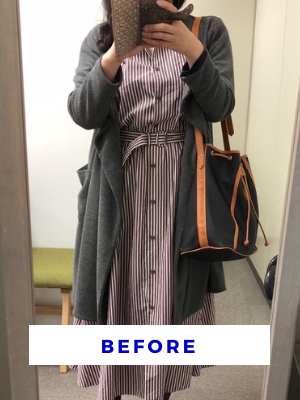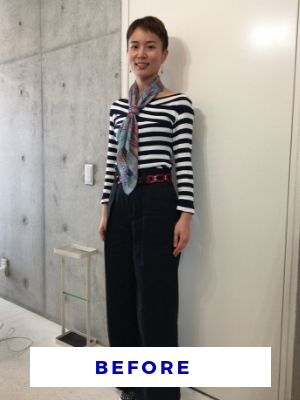 またコンサルを機に断捨離を実施、今までしっくりこなかったアイテムも思い切って捨てることが出来ました。今までトライしたことのなかった色のストライプ、アクセサリーも、色や柄を気をつけて買うことですごくフィットして驚いています。