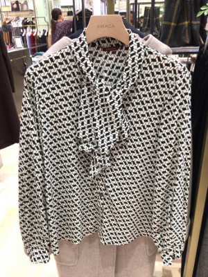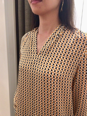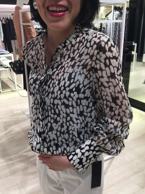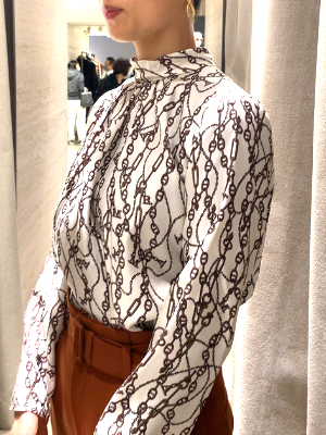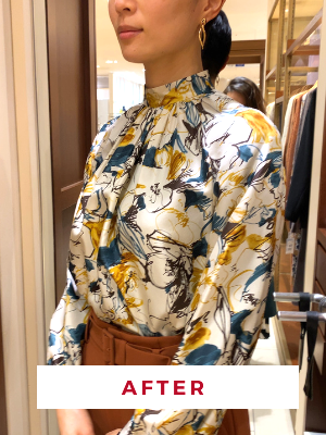 E様のエレガントさを最大に引き出すだけでなく、上質さにこだわった今回のショッピング。こちらのエレガントなブラウスは、Max Maraのもの。華やかさを引き出すブラウスは、柄の選び方が最大のポイント。
