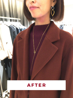 ご自身にお似合いのカラーやデザインに挑戦したい!というご要望を受けて、変化の勢いをつけるため、コートを含め、冬でも通勤が楽しくなるようなカラーアイテムを主にご提案。