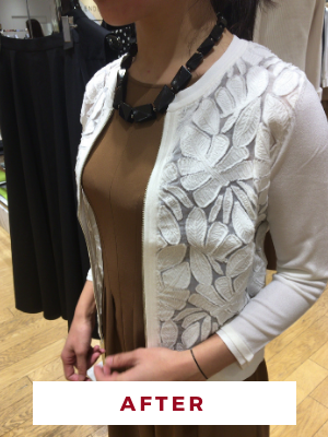 腕を出すのは年齢的に避けたい!そんなN様にあえて、腕を上品に出すアイテムを。今までの思い込み&コンプレックスを払拭する、感動のデザインに出会えるのはパーソナルショッピングの醍醐味。