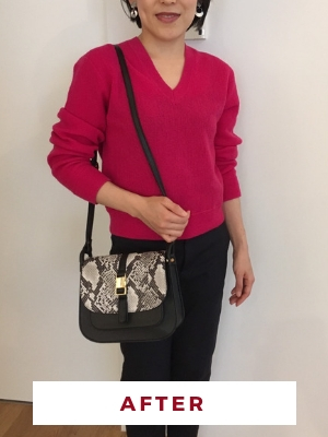本当に目からウロコのコンサルでした。今まで似合うか確信の持てなかったアイテムが、似合うと分かったり、意外なアイテムが似合ったりと、コンサルの後ワクワクが止まりませんでした。