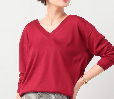 襟周りのデザイン以外にも、襟周りの淵のデザイン、襟の深さ等でも印象は全く変わります。写真下、左のお写真の方が同じVネックのニットでもカジュアル感が強く、襟が強調されたように感じます。イメージとしては、ほっこりとしたニットのような印象。