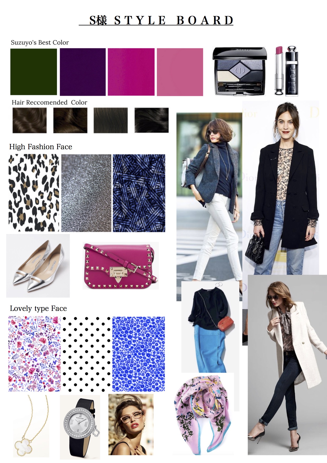 パーソナルカラー診断、骨格診断、ヒヤリングなどを重ねて、分かったことは、S様が比較的クールなスタイル(直線的:ハイファッション、Winter color)と、比較的キュートなスタイル(曲線的:ラブリースタイル)が同時に似合う、良い意味でとても珍しいタイプの女性だということ!