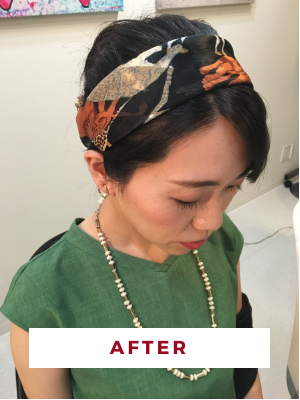N様が手持ちでお持ちだったスカーフを使って、ヘアアレンジさせて頂きました◎ 意外に簡単なアレンジ、メイクも変えれば一気に別人のオーラです!!