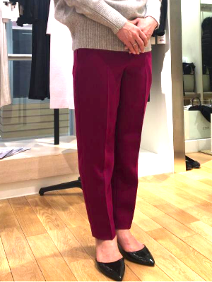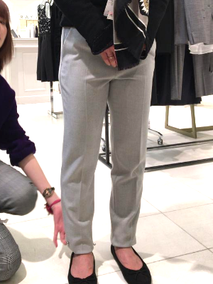 XSサイズを試着した後も、足が一番美しく見える長さを調整します。普段どんな靴を履くかで、パンツの長さが決まりますよ◎