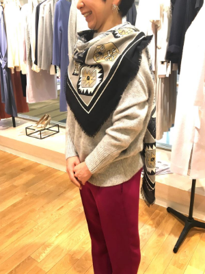 柄物をトップスに持っていくことで、目線を上に持っていく(スタイルを更に良く見せてくれる)効果もあるのがストール。